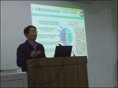 朱坦教授从中国环境保护事业发展历程、走进生态文明、中国特色的生态文明发展之路三方面介绍,进行了一场内容丰富的精彩讲座。首先,他结合自己丰富的环保实践经验讲解了中国的环境保护的三个阶段。从宏观政策和微观实践两个角度,系统梳理了我国的环境质量调查和污染治理在不同时代背景下的主要内容和工作重点,介绍了中国的环境保护工作在全球视角下的国际定位。朱坦教授指出,现阶段中国的环境保护工作要以可持续发展思想为指导,推进绿色、循环、低碳发展模式,将环境保护与经济、社会发展相协调,走生态文明发展之路。随后,朱坦教授详细剖析了生态文明的概念和理念内涵,强调了尊重自然、顺应自然、保护自然的自然观,并为大家详述了中、西方文化中生态文明的思想渊源,指导我们要走中国特色生态文明建设之路,将生态文明切实纳入我国“五位一体”的整体布局,强调了环境保护是生态文明建设的主阵地和根本措施。最后,朱坦教授满怀感慨地激励所有同学,希望新一辈的环境工作者们能够推进生态文明,共建美丽中国,实现中国梦!