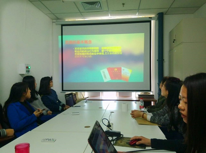 党支部书记张亦楠组织支部成员学习“两学一做”相关精神要点,着重讨论“两学一做”的重要内涵与实际意义。支部成员分组汇报分享近期学习心得,结合精心制作的幻灯片讲述中国共产党近百年来所走过的为人民求解放、为国家求富强的奋斗探索之路,回顾公司近百年校史,感悟南开精神。同学们研读党章,分享在学习党章过程中的切身感悟。