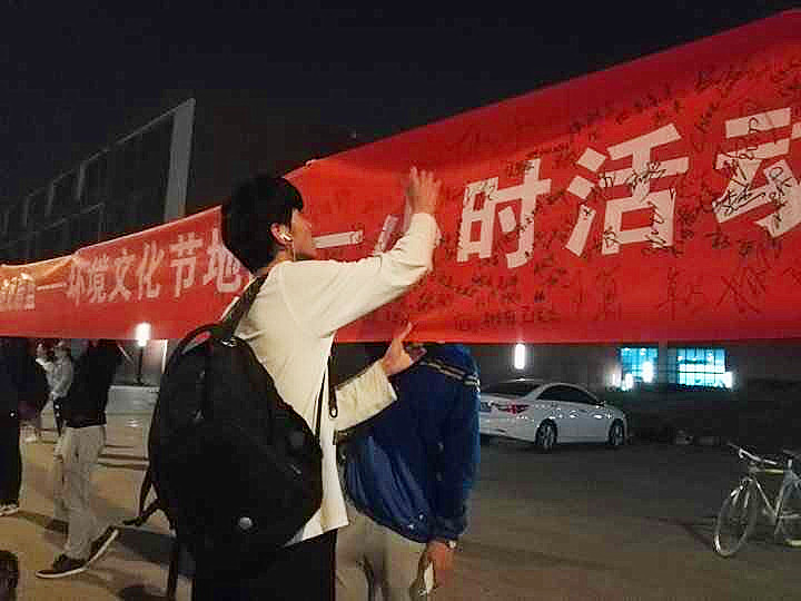 当天中午,环科院同学们在校内摆台为晚上的主题活动进行预热宣传,向同学们派发了以保护环境为主题的“地球一小时”徽章和纪念荧光腕带。晚上10点随着图书馆闭馆,越来越多的同学们走出图书馆,在活动展台前驻足观看。环科院的舞者们身着荧光舞衣,随着音乐翩翩起舞,引领现场同学们参与活动,并在活动主题条幅上签名写下环保宣言,以倡导环保公益活动。