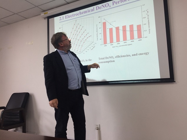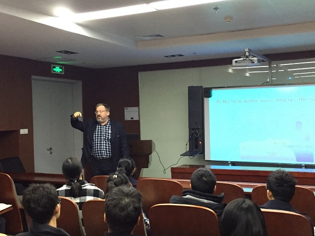 参观结束后,Kenneth教授为环科院的师生进行了题为“Water innovations must solve the water challanges of the 21st Century!”的学术报告。Kenneth教授从城市化,全球工业水投资,市政水投资等方面分析了创新的必要性,明确了实现水资源可持续发展这一目标的条件及途径。报告最后,他详细分析了污水处理过程中的水化学条件及所面临的问题,为公司师生在此方面继续展开研究提供了借鉴与参考。随后,于宏兵教授与Kenneth教授就电化学法处理高盐有机废水,脱硫脱硝等多方面进行了数次深入的探讨,结合新搭建的实验平台,双方分别介绍了学术研究的新动态和新成果,以及科研中的疑点和难点问题,互相交换了意见与建议,为双方进一步合作奠定了基础。