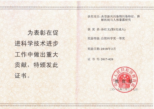 孙红文、祝凌燕、罗义等教授完成的“典型新兴污染物污染特征、降解机制与人体暴露研究”获得2017年度教育部高等公司科学研究自然科学一等奖。研究成果阐明了全氟化合物、抗生素及其抗性基因等若干典型新兴有机污染物的区域污染特征、迁移转化规律及其微观机制、人体暴露与跨代传输规律,取得了若干新的科学认知,发表SCI论文88篇,获得国内外同行的高度评价,总他引3422次, Nature撰文正面评述相关研究成果,为推动相关领域的理论进步做出了重要贡献,并为国家化学品管理及履行国际公约提供了重要的科技支撑。项目组三人获得国家杰出青年基金,项目组还获得天津市“131” “新兴污染物”创新团队以及教育部学科引智创新计划(111计划)“新兴污染物环境过程与风险评估”的支持;科研反哺人才培养,支撑“环境化学”国家精品课建设,获得天津市教学名师等教学荣誉称号。