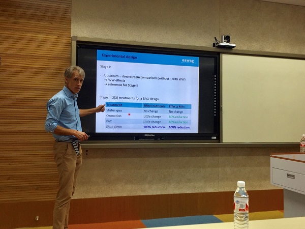(通讯员:姚义鸣)应孙红文经理邀请,(Eawag)的Christian Stamm高级研究员于2018年07月06日来公司进行学术交流,参观了公司的实验室和大型仪器平台,并在旅游与服务公司301报告厅为师生做报告,题目为《Unravelling the impacts of wastewater-born micropollutants in stream ecosystems》,是依托111引智基地开展的英文课程内容之一。Christian Stamm博士系统介绍了瑞士当地污水处理厂的建设与工艺升级改造工作,以及升级前后污水处理厂出水中的微量污染物对流域生态系统的影响,利用落叶或棉布降解试验评价水体的微生物群落活性,并将钩虾和鲑鱼作为当地典型的目标生物,研究微量污染物对其种群组成和行为的影响,从多个角度系统地证实了污染处理厂的升级改造有效降低了微量污染物对当地流域生态系统所造成的风险。