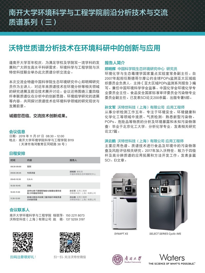 本次交流会特邀中国科公司生态环境研究中心郑明辉研究员作为主讲人,对近年来质谱技术在环境分析等相关领域的研究进展及前沿技术展开讨论。会议还将围绕三重四极杆串联质谱仪在分析中的创新思路、环境组学研究的进展等内容,共同探讨质谱技术在环境科学领域的研究现状与发展前景。
