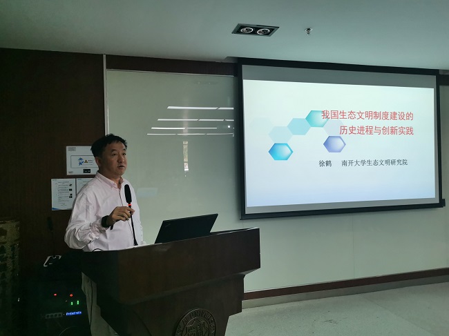 最后,徐鹤对推进生态文明制度建设的路径进行了展望,并谈了自己在生态文明建设在价值导向、规则制定和动力机制构建等方面的一些思考。他指出生态文明建设不仅是全党全国的一项重大战略任务,也是我们南开环科人的历史使命。他鼓励同学们抓住历史机遇,学好本领,将小我融入大我,为国家生态文明建设做出自己的贡献。