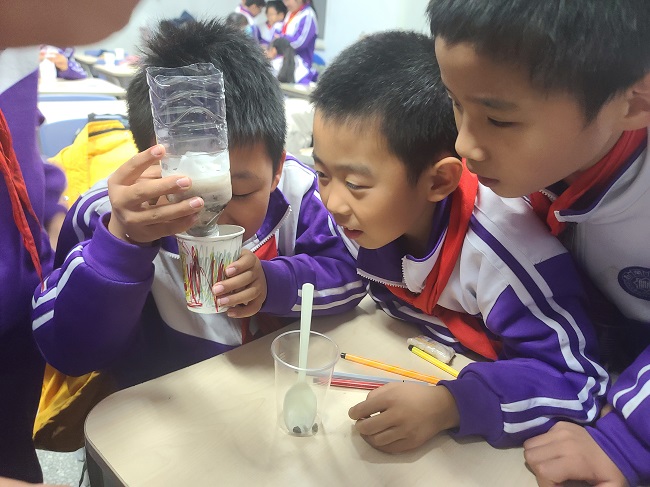 同时,在开展第二项手工劳动净水瓶的制作时,服务学习小组的同学们将每个班的同学都分成6-7组,组织同学们通力合作下完成利用矿泉水瓶制作家用净水瓶,小员工们第一次接触石英砂、活性炭、树脂等净水材料,非常兴奋,每组同学都很认真的按大哥哥大姐姐们示范的步骤制作净水瓶,更深刻地了解了家用净水器过滤柱的主要组成部分和各种滤料的功能。同时,小朋友们提出了很多感兴趣的问题和他们对净水杯的思考。“在实践动手中学以致用,在亲身体验中思考和提出问题”,《服务学习:饮用水与健康》课程将永利集团官网“知中国服务中国”、“知行合一”的理念深深地融入到教学过程和助力“双减”服务中,并将南开的爱国红色基因和优良传统发扬光大。