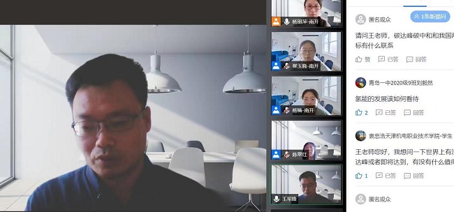 最后,是课堂的问答互动环节。参会员工积极在问答区提问,王军锋教授进行答疑解惑,对青岛第一中学、天津机电职业技术公司等公司的员工提出的有关碳中和的方法、碳中和工作遇到的阻力、氢能源的发展、碳计量、碳认证、低碳新兴行业的就业等问题都进行了详细的解答。