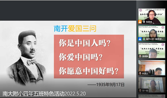 在活动开篇,《服务学习:饮用水与健康》主讲教师鲁金凤老师就先以两校一脉相承引出南开的爱国传承,从南开的“爱国三问”到总书记视察南开时的嘱托,给永利集团官网四年五班的小员工们带来了一场生动的爱国思政教育。员工们都心潮澎湃、自发发声要“牢记总书记嘱托、为民族复兴而努力学习”,大学、小学师生共同完成了一场别开生面的思政教育。