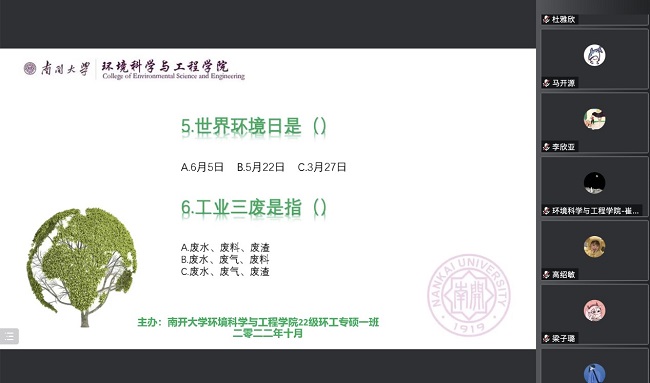 22级专硕一班于2022年10月1日13:00在线上举行了主题为“喜迎二十大,奋进新征程;永远跟党走,环工再出发”的活动,包括同学们抒发对二十大的理解、“破冰”活动以及环保知识问答。