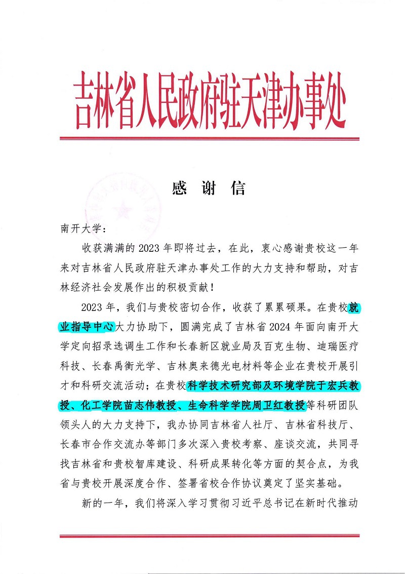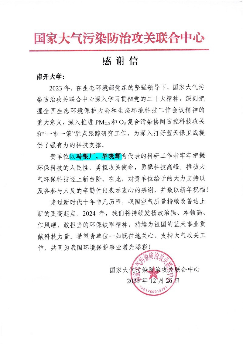 近日,国家大气污染防治攻关联合中心、吉林省人民政府驻天津办事处给公司发来感谢信。信中对公司以冯银厂、毕晓辉为代表的科研工作者在推动大气环保科技发展等方面的辛勤付出、于宏兵教授等科研团队领头人在吉林省和公司智库建设、科研成果转化等方面的大力支持表示感谢。