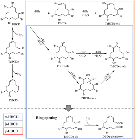 摘要:六溴环十二烷(HBCD)是世界上第三大溴系阻燃剂,已被列入斯德哥尔摩公约持久性有机污染物。本研究揭示了一株假单胞菌对三种HBCD同分异构体的降解效率及转化途径。其中α-HBCD的代谢路径最为单一,ß-HBCD在水解脱卤的基础上可脱掉溴原子及其邻位的氢原子,形成双键,γ-HBCD的降解路径最为丰富,还可以脱掉相邻的溴原子形成双键。